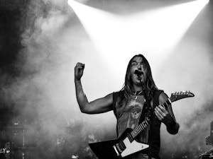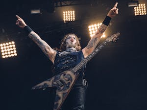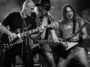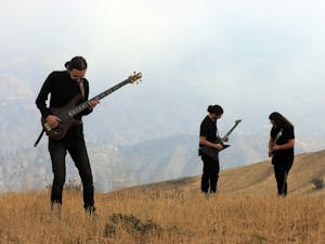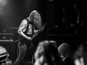 Die düstere Metalband MN KLLD BY SNT präsentiert ihre sonderbare Musik, begleitet von langen Haaren und Bärten.